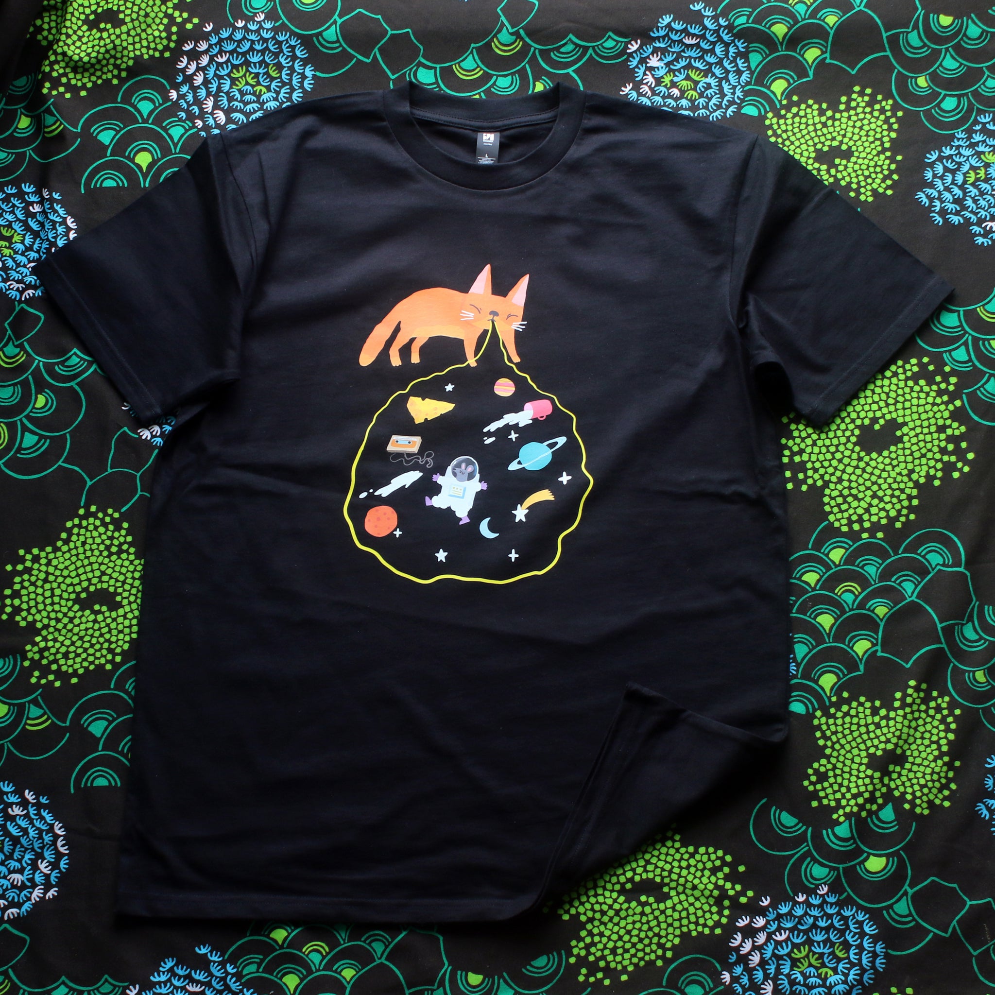 Cat pukes the universe. Black T-shirt for the classic looks.